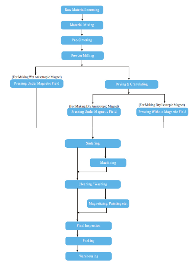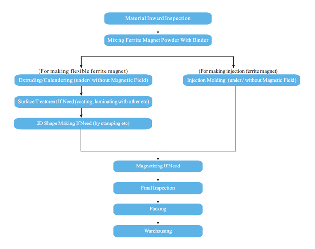 산화철을 주원료로 하여 열가소성 수지와 혼합하여 사출 성형하는 "페라이트 사출 자석" 제품과 소결 가공하여 제조하는 "페라이트 소결자석" 이 있고 가격이 저렴하여 가장 광범위하게 사용하는 제품